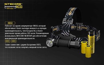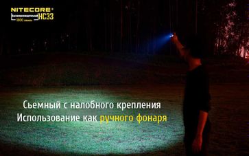 Как и предшественник, НитеКоре HC33 это малогабаритный, многофункциональный фонарь, Г-образной конституции, с налобным крепление в комплекте. Изделие работает на 1 аккумуляторе 18650 или 2-х морозостойких батарейках CR123A, его можно применять как налобный, велосипедный либо как карманный.
