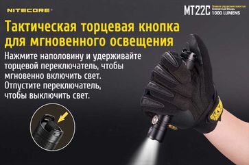 Но колесо управления не отвечает за включение и выключение НайтКор MT22C, для этого имеется торцевая, тактическая, кнопка! Тактическая кнопка в торце продукта, не только позволяет использовать NiteCore MT22С в качестве тактического пистолетного фонаря (хват Харриса — удержание обратным хватом), обеспечивает моментальное включение, с фиксацией и без оной, но и может быть заменена на выносную кнопку NiteCore RSW1. А с выносной кнопкой, MT22C станет полноценным подствольным фонарем для ружей и карабинов, тем более что по диаметру корпуса он совместим с дюймовыми кольцами креплений, и с любыми готовыми комп
