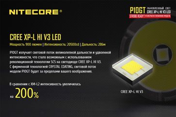 Этих качеств удалось добиться благодаря тому, что фонарь NiteCore P10GT оснащен новейшим, американским, обездомленным светодиодом CREE XP-L V3 Hi, который обеспечивает предельную дальность фонарям в своем классе. Суть данной технологии заключается в том, что у светодиода не формируется силиконовая линза. Это позволяет значительно увеличить осевую плотность света за счет уменьшения яркости боковой засветки и площади центрального пятна, и положительно влияет на насыщенность центрального пучка света фонаря.