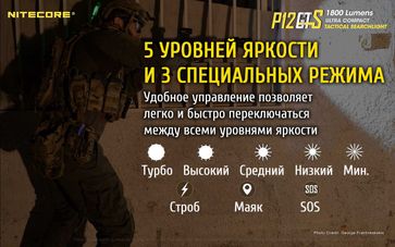 Фонарь NiteCore P12GTS имеет 5 основных режимов яркости.