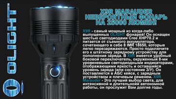 Самый мощный, светодиодный, поисковый, аккумуляторный фонарь от Олайт — Olight X9R Marauder, это 25 000 люмен широкого света с дальностью до 630 метров.