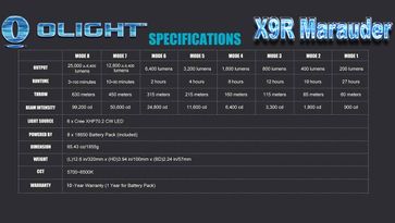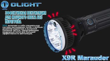 Модельный ряд поисковых фонарей OLIGHT обрел нового лидера — X9R Marauder это самый большой и самый яркий фонарик созданный фирмой Олигтч! Олайт X9R, для достижения яркости в 25 тысяч люмен, использует шесть современных светодиодов Cree XHP 70.2 CW. Дизайн корпуса, этого продукта, напоминает старые фонари серии SR – INTIMIDATOR (долго державший первенство среди дальнобойных, диодных фонарей). Однако по содержанию, это типичный представитель серии – X, приходящий на смену модели X6 Marauder, тоже с широким углом и феноменальным световым потоком.