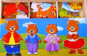 Для детей от 2х лет. Яркая игрушка изготовлена из экологически чистой древесины. Игрушка представляет собой ящичек с крышкой в виде рамки-вкладыша. Вкладыши, состоящие каждый из 3 частей, представляют собой членов медвежьей семьи - папу, маму и двух медвежат. В ящичке имеются запасные части к рамке-вкладышу, позволяющие переодевать медведей в разные наряды. Игра с такой рамкой-вкладышем помогает развитию у детей сообразительности, внимания, логического мышления,фантазии, усидчивости, моторики пальчиков.