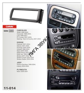 CARAV 11-014 CHRYSLER 300M 1999-2004; Concorde 1998-2004; LHS 1998-2001; PT Cruiser 2000-2005; Sebring 2001-06; Town& Country 2001-07 / JEEP Grand Cherokee 1999-2004; Liberty 2002-2007; Wrangler 2003-06 / DODGE Caravan 2001-07; Dacota 2001-04; Stratus 2001-2004; Durango 2001-03; Neon 2000-2006; Intrepid 1998-2005; RAM Pickup 2002-2005; RAM 2000-2005; Stratus 2001-2006; Van 2002-03; Viper 2003-09 / PLYMOUTH Neon 2000-2001; Voyager 2001 Переходная рамка предназначена для установки автомагнитолы стандартного размера 1-DIN вместо штатного головного устройства. Цвет и текстура пластика рамки 100% повторяют интерьер торпедо автомобиля. В комплекте имеется вся необходимая для монтажа фурнитура.
