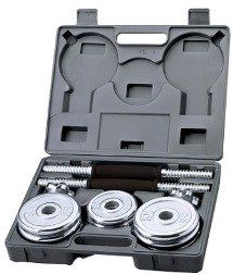 Общий вес: 15кг В комплекте: Гриф гантельный: 2шт, Длина: 35см, Диаметр: 25,4мм, Замок: гайка Вейдера с резьбой (сталь) - 4шт. Материал: высокопрочная сталь, хромированный Материал рукояти: хром, покрытый высокопрочным пластиком с противоскользящей насечкой (не вращающаяся) Вес грифа: 1,8кг Диски: 1,14кг - 8шт; 0,57кг - 4шт Тип: хромированные Посадочный диаметр: 25.4мм Материал: хромированная сталь Набор поставляется в комплекте с пластиковым кейсом для удобства хранения и переноски. Из данного набора можно собрать две гантели весом по 7.5кг каждая. None