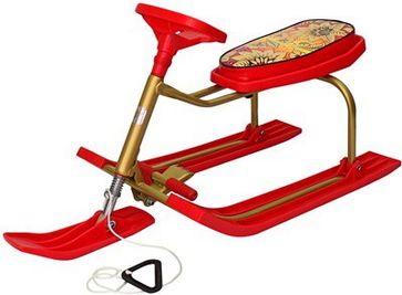 Стальная несущая конструкция, широкие лыжи из прочной пластмассы, не трескающиеся при температуре до -40, и удобное сиденье из искусственной кожи, длительное время сохраняющее тепло.