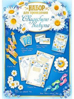 Набор для проведения свадебного выкупа (FD-H-94) K011201 Красочный набор для проведения традиционного ритуала - выкупа невесты. Красиво декорированный, он позволит увлекательно провести интересный обряд, дарящий позитивные эмоции новобрачным и гостям праздника. Комплект состоит из трех плакатов, сценария, нескольких занимательных игр, следов и стрелок. Аксессуар выполнен в ярких синих тонах, украшен изображениями ромашек. Свадебный набор для выкупа привнесет в сценарий торжества романтический колорит. Размеры: 45x60 см Мин. заказ 500 руб.