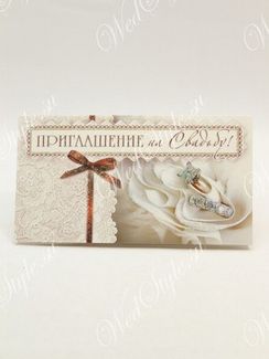 Приглашения свадебные с блестками (310-611-T) K010486 Изящное свадебное приглашение в нежных оттенках цвета айвори. Левая часть обложки аксессуара декорирована тонкой атласной лентой шоколадного тона на фоне узорчатого тиснения. Справа - изображение обручальных колец с камнями, расположенных в лепестках роскошной розы. Торжественные слова приглашения напечатаны на внутренней стороне горизонтальной открытки. Стильный аксессуар украсит свадьбу любого формата. Цена указана за 1 шт. Продаются упаковками по 10 шт. Материал: дизайнерский картон. Длина: 13,5 см, ширина: 7,5 см Мин. заказ 500 руб. Мин. партия товара: 10 шт.