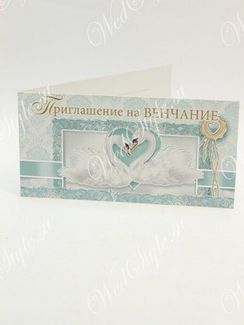 Свадебные приглашения на венчание (GKMP 098.424) K010552 Лаконичное приглашение на венчание, выполненное на дизайнерской бумаге, привлекает нежным оттенком бирюзового цвета. В центре обложки открытки - изображение белых лебедей, символизирующих верность чувств новобрачных. Романтическое сердечко и орнаментальные узоры дополняют композицию. Приглашение на венчание отражает светлую ауру предстоящего события. Цена указана за 1 шт. Продаются наборами по 10 шт. Материал: дизайнерский картон. Длина: 12,5 см, ширина: 6,5 см Мин. заказ 500 руб. Мин. партия товара: 10 шт.