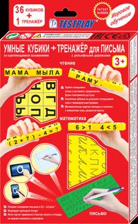 В состав входит два учебных пособия: Умные кубики, для обучения чтению и математике, и Тренажер для письма, для обучения письму. Пособие Умные кубики представляет собой набор из 36 кубиков, на гранях которых написаны буквы русского алфавита, знаки препинания, цифры и знаки математических действий. Благодаря специальной конструкции (выступ с одной стороны и отверстие с другой), кубики могут скрепляться между собой. Таким образом можно составлять слова, предложения, примеры. Так как кубики можно скреплять только определенным способом, ребенок не сможет расположить их неправильно (зеркально или к верх ногами), что важно на этапе обучения, чтобы не сформировались неправильные представления о буквах. Количество букв, цифр и знаков на гранях кубиков выбрано с учетом частоты их использования и позволяет составлять достаточно сложные слова, предложения и примеры. Длина грани кубиков - 1,5 см. Детям удобно их держать и скреплять, в процессе игры тренируется мелкая моторика рук. При использовании кубиков для обучения математике можно не только составлять примеры, но и дать представление о длине отрезков, площади и объеме предметов. Тренажер для письма TESTPLAY представляет собой пластмассовую пластину, на обе стороны которой нанесены буквы и их элементы в виде сенсорных дорожек с рельефным дном. Ребенок ставит ручку на дорожку и обводит букву прямо на пластине. Буквы воспринимаются ребенком в виде “считываемых” с рельефной дорожки сенсорных и звуковых сигналов. На тренажере нанесены буквы русского алфавита строчные и заглавные, печатные и письменные, причем там где возможны расхождения, приведены 2 варианта написания письменных букв, а также элементы букв и цифры. Использование тренажера при обучении ускоряет овладение письмом в 2,5-3 раза и сокращает затраты времени по сравнению с технологией изнурительного многократного механического переписывания букв из традиционных прописей в тетрадь. Нагрузка на зрение при письме и общая утомляемость снижаются. Одинаково подходит как д