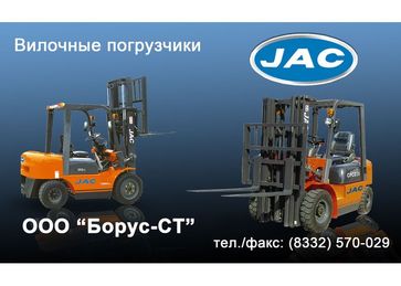 Компания “Борус - СТ” предлагает автопогрузчики фирмы JAC (производство Китай). Автопогрузчики JAC представляют отличное соотношение цена – качество. При невысокой цене они заключают в себе экономичность, экологичность и маневренность. Модельный ряд представлен погрузчиками CPCD 10, CPCD 15, CPCD 18, CPCD 20, CPCD 25, CPCD 30, CPCD 35, CPCD 40, CPCD 45, CPCD 50, CPCD 60, CPCD 70, CPCD 80, CPCD 100. Г/п от 1 до 10т, двигатель XINCHANG/ CHAOYANG, АКПП, пневмоход, стрела 3м, длина вил от 920 до 1220мм, проблесковый маячок. Дополнительные опции: кабина с отопителем, высота подъема до 6 м, свободный ход, передние сдвоенные колеса, смещение вил, установка нейтрализатора выхлопных газов, колеса типа “суперэластик”.