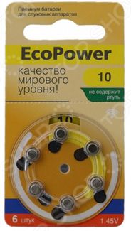 Батарейка для слуховых аппаратов ECOPOWER Type 10 сменный элемент питания для личных приборов усиления слуха, поддерживающих типоразмер 10. Изделие произведено в соответствии с принципами защиты окружающей среды и здоровья человека: не содержит ртуть. Напряжение батарейки 1,45 В. В наборе 6 штук. None Возможен самовывоз. Есть доставка.