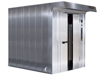 Продукция помещается на лотки, которые закрепляются на тележке, после чего тележка закатывается внутрь ротационной хлебопекарной печи. Такая конструкция печи крайне удобна простой загрузкой и выгрузкой продукции, одни и те же тележки могут использоваться как в печи, так в расстойных шкафах или для транспортировки хлеба внутри производственного цеха.