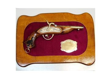 Пистолет с латунным стволом, латунным капсульным замком, резьба, травление по металлу. Пистолет производит шумовой эффект, благодаря заряжанию охотничьими капсулями. Заключение: представленное изделие является сувениром (отсутствие запального устройства). Поставляется на бархатном стенде. Производство Россия. Историческая справка: Первая половина 19 в. Эти пистолеты None