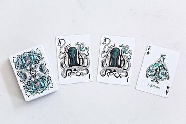 Набор карт «Ellusionist Fathom» станет отличной покупкой для тех, кто ценит качество и изысканное внешнее оформление. Рубашка напоминает о морских волнах, также, как и «Туз», на котором изображен ужасный Кракен. О долговечности можно не беспокоиться, так как за неё отвечает плотный картон с покрытием из пластика. Это хороший вариант не только для себя, но и в качестве подарка для дорогого человека.