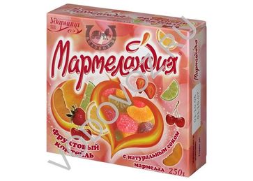 «Фруктовый коктейль «Мармеландия» — яркий мармеладный микс 4х4 – четыре незабываемых вкуса (клубника, лимон-лайм, абрикос, черешня) и четыре формы мармелада в виде ягод и долек фруктов. «Фруктовый коктейль» в своем составе содержит фруктовое пюре и соки натуральных фруктов, а также пектин, уникальное природное вещество, которое получают из цитрусовых. Пектин способен выводить из организма тяжелые металлы и радионуклиды. Состав: сахар-песок, патока, желеобразователь — пектин, регуляторы кислотности — кислота лимонная, цитрат натрия, сухие соки и пюре тропических фруктов, идентичные натуральным ароматизаторы (вишня, абрикос, клубника, лимон-лайм), натуральные красители — кармин, хлорофиллин, куркумин. None