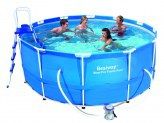 Bestway 56420 (56088) Бассейн круглый на стойках Технические характеристики: . Форма бассейна: круглая . Каркас: металлические стойки . Материал бассейна: 3-х слойный армированный ПВХ . Производительность фильтр-насоса: 2006 л/ч . Вместимость (90%): 10250 л . Гарантия: 14 дней . Артикул: 56420 (56088) . Производитель: США . Страна изготовления: КНР В комплекте: . Электрический фильтрующий насос 58383 (58148) . Картридж 58094 . Лестница 58097 . Настил под бассейн 58002 . Тент 58037 . Руководство по эксплуатации . Ремкомплект . DVD-диск с инструкциями по установке Размеры и вес в упаковке: 56 х 40 х 121 см / 56 кг Размеры (Д.Ш.В.): 366 х 366 х 122 см Вес: 52,2 кг Описание: Бассейн круглый на стойках Bestway 56420 (56088) Steel Pro очень легко и быстро устанавливается. Процесс сборки бассейна до наполнения водой занимает не более 1 часа. Бассейн изготовлен из высококачественного материала с применением особой технологии, которая придает стенкам бассейна тройную прочность. Стенки сделаны из трех отдельных слоев: два слоя плотного винила и один - полиэстр для особой прочности. Поддержанию формы бассейна Bestway способствует лента из полипропилена, опоясывающая весь бассейн. Также прочность бассейна обуславливается его коррозионностойким металлическим каркасом с гальваническим покрытием. Удобный сливной клапан присоединяется к садовому шлангу. Таким образом, воду можно слить в любое удобное место или, например, полить сад. Bestway 56420 (56088) диаметром 366 сантиметров это оптимальный полноценный каркасный бассейн для тех, кто очень хочет иметь на дачном участке личный летний водоем, но не располагает для этого большими свободными пространствами. Хорошее решение для небольших дружных семей, которые любят отдыхать вместе. Ведь даже на небольшой территории можно получать большое удовольствие. Каркасный бассейн для дачи Bestway 56420 (56088) достаточно прост в установке. Самое сложное это найти ровную площадку. Бассейн для детей и взрослых Bestway 56420 (56088) с удов