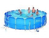 Bestway 56462 Бассейн круглый на стойках Технические характеристики: . Форма бассейна: круглая . Каркас: металлические стойки . Материал бассейна: 3-х слойный армированный ПВХ . Производительность фильтр-насоса: 5678 л/ч . Вместимость (90%): 23062 л . Гарантия: 14 дней . Артикул: 56462 . Производитель: США . Страна изготовления: КНР В комплекте: . Электрический фильтрующий насос 58389 . Картридж 58012 . Лестница 58331 . Настил под бассейн 58031 . Тент 58039 . Руководство по эксплуатации . Ремкомплект . DVD-диск с инструкциями по установке Размеры и вес в упаковке: 70 х 50 х 160 см / 91 кг Размеры (Д.Ш.В.): 549 х 549 х 122 см Вес: 85,7 кг Описание: Бассейн круглый на стойках Bestway 56462 Steel Pro очень легко и быстро устанавливается. Процесс сборки бассейна до наполнения водой занимает не более 1 часа. Бассейн изготовлен из высококачественного материала с применением особой технологии, которая придает стенкам бассейна тройную прочность. Стенки сделаны из трех отдельных слоев: два слоя плотного винила и один - полиэстр для особой прочности. Поддержанию формы бассейна Bestway способствует лента из полипропилена, опоясывающая весь бассейн. Также прочность бассейна обуславливается его коррозионностойким металлическим каркасом с гальваническим покрытием. Удобный сливной клапан присоединяется к садовому шлангу. Таким образом, воду можно слить в любое удобное место или, например, полить сад. Bestway 56462 диаметром 549 сантиметров это самый большой каркасный бассейн для дачи с полным набором необходимых аксессуаров, который по достоинству оценят все. В бассейне Bestway 56462 можно купаться всей большой и дружной семьей, а для большего веселья еще и пригласить друзей. Главное, чтобы на участке нашлось для него свободное место. Каркасный бассейн для дачи Bestway 56462, несмотря на свои гигантские размеры, совершенно не сложно установить своими силами. Достаточно найти ровную площадку. Семейный бассейн Bestway 56462 рассчитан на большую дружную компанию. Диаметр и высо