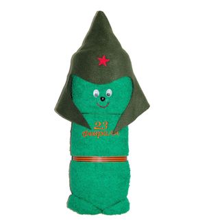 <p>Отличный мужской сувенир - полотенце свернутое особым образом в виде фигурки.</p> <p>Патриотичное зеленое полотенце в буденовке свернуто таким образом, что выглядит как человечек. Такая оригинальная упаковка делает его идеальным подарком на 23 февраля для коллег, партнеров, важных клиентов. <br /><br />Отлично это полотенце справится и с задачей дополнения к подарку дорогому мужчине. Невозможно не умилиться фантазии создателей этого чуда. А после праздника компактное полотенце может стать лучшим помощник в вопросах гигиены в командировке или на отдыхе.</p> <p>Полотенце можно развернуть и пользоваться им как обычным полотенцем для рук или для лица. <br /><br />Размер полотенца в развернутом виде:</p> <ul> <li>9050 см (фигурка 3010,5см)</li> <li>14070 см (фигурка 3613 см)</li> </ul> <p>Сувенир идет в прозрачном пакете.</p> Наличные, безнал., карты, эл. деньги, юр. лица Возможен самовывоз. Есть доставка.
