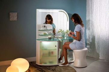 Туалетный столик «Гарда» - модель своенравная. Большое зеркало, подсветка, стеклянные полочки и столешница выглядят очень изящно!