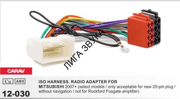 Переходник ISO CARAV 12-030 ISO MITSUBISHI 2007+ (только для а/м без навигации и без усилителя Rockford Fosgate) ПЕРЕХОДНИК ISO (питание + акустика): ISO (female) <---> CARAV 12-030 <---> Штатный разъем (male) / модель подходит только для а/м без навигации с штатным 20-пин разъемом, без штатного усилителя Rockford Fosgate