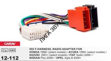 Переходник ISO CARAV 12-112 ISO-F HONDA 1999+ / ACURA 1999+ / SUZUKI 2001+ (выборочн. модели) / FIAT Sedici 2006+ / NISSAN Pixo 2009+ / OPEL Agila B 2008+ ПЕРЕХОДНИК ISO (питание + акустика): Штатный разъем (female) <---> CARAV 12-112 <---> ISO (male)