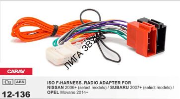 Переходник ISO CARAV 12-136 ISO-F NISSAN 2006+ / SUBARU 2007+ (выборочн. модели) / OPEL Movano 2014+ ПЕРЕХОДНИК ISO (питание + акустика): Штатный разъем (female) <---> CARAV 12-136 <---> ISO (male)