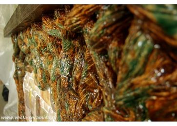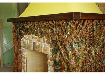 Камин "Бурелом" выполнен не по обычной технологии (облицовка изразцами), каждый элемент данного камина вылеплен вручную и расписан майоликовыми глазурями. Смотрится очень эффектно.