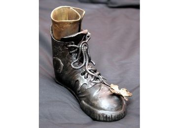 Ботинок стальной кованый. Развязывать шнурки и примерять на ногу не рекомендуется. Может служить молчаливым оригинальным оформлением камина или нести некоторую функциональную нагрузку, например, держать кочережечку или другую какую ковырялочку для камина. Если хотите, можете налить в него воды, и поставить цветы... Можно не наливать воды и поставить в него металлически е цветы... Такие мы тоже Вам сделаем.