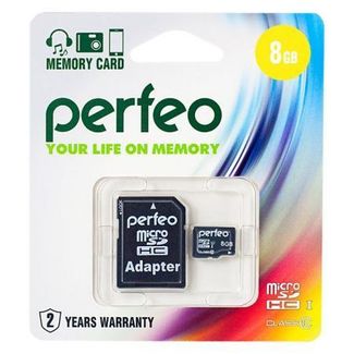 - Карта памяти Micro SDHC 8Gb Perfeo Class 10 + адаптер SD (PF8GMCSH10A) по выгодной цене 294 р. руб.;