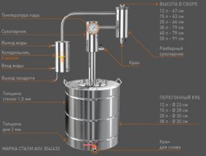 Самогонный аппарат «Триумф» отличается следующими техническими особенностями и эксплуатационными преимуществами: • Перегонный куб из пищевой нержавеющей стали с ребрами жесткости объемом 12-50 литров на выбор со встроенным краном для удобного слива отработанной флегмы, с толщиной дна 2 мм и стенок 1,5 мм. Может использоваться на плитах всех типов, в том числе, индукционного нагрева. Оснащен удобными ручками • Широкая горловина для удобного мытья емкости, фланцевое герметичное соединение на барашках через оригинальную прокладку из пищевого термостойкого силикона • Сразу два последовательно размещенных сухопарника: первый – со встроенным термодатчиком, а второй – разборный, что позволяет вносить в него ароматические добавки (цитрусовую цедру, фрукты и т.п.). В каждом из сухопарников предусмотрены краники для слива флегмы • Высокоэффективный холодильник проточного типа со змеевиком на 5 витков Самогонный аппарат «Триумф» отличается простотой в использовании, надежностью, высокой производительностью и при этом относится к категории бюджетных решений, наиболее доступных по цене. Комплектация Перегонный куб (бак под брагу) 1 шт. Сухопарник 2 шт. Трубки переходные 1 шт. Холодильник со змеевиком 1 шт. Биметаллический термодатчик 1 шт. Кран на сухопарник 2 шт. Силиконовая прокладка 1 шт. Барашки 6 шт. Спиртомер (0-96 гр.) 1 шт. Коробка 1 шт. Технический паспорт 1 шт. Книга рецептов (пособие для начинающих) 1 шт. Пачка спиртовых дрожжей (100 гр.) 1 шт. None