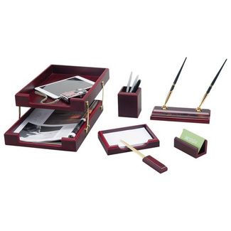 Настольный набор премиум-класса из дерева цвета "красное дерево" с золотистой фурнитурой состоит из 6 предметов. Набор содержит всё необходимое для того, чтобы сделать рабочее место не только комфортным, но и элегантным. Комплектация:Двойной лоток для бумаг.Подставка для ручек (2 шариковые ручки в комплекте).Стакан-подставка для письменных принадлежностей.Подставка для бумажного блока.Подставка для визиток.Нож для вскрытия конвертов. None