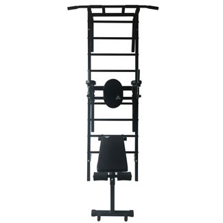 Многофункциональный домашний тренажер в виде шведской стенки с турником и скамьей. Высота турника меняется путем перевешивания на другой уровень, таким образом можно подстра None