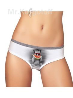 Трусики-слип из хлопка с эластаном, заниженный пояс отделан контрастной широкой тесьмой, на фронте принт "малыш со вкусняшкой". Минимальный заказ - 750 руб. Возможен самовывоз. Есть доставка.