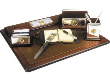 Luigi Pesaresi – один из ведущих итальянских дизайнеров, все изделия которого выполнены с безупречным вкусом. Настольный набор и аксессуары сделаны из ценных пород дерева, кожи теленка и серебра. На каждой серебряной накладке факсимильная подпись основателя бренда. Набор выглядит не просто презентабельно, он выглядит величественно. Тиснение (Блинт) на данный товар осуществляется бесплатно. Оплачивается только настройка оборудования в размере 3000 рублей на весь тираж. None