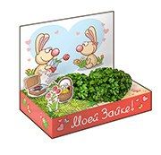 Открытка представляет собой коробочку, с одной стороны есть место для написания ваших пожеланий. Откройте открытку, высыпьте семена в контейнер, где находится специальный материал для проращивания. уже через 3-4 дня в открытке вырастет пышный газон из зелени. В комплекте вы найдете 3 тематические фигурки. Их можно разместить рядом с газончиком, вставив в специальные отверстия, а можно поставить прямо в травку. Не забывайте поливать ваш мини-садик, и он будет радовать вас долго:)