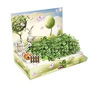 Открытка представляет собой коробочку, с одной стороны есть место для написания ваших пожеланий. Откройте открытку, высыпьте семена в контейнер, где находится специальный материал для проращивания. уже через 3-4 дня в открытке вырастет пышный газон из зелени. В комплекте вы найдете 3 тематические фигурки. Их можно разместить рядом с газончиком, вставив в специальные отверстия, а можно поставить прямо в травку. Не забывайте поливать ваш мини-садик, и он будет радовать вас долго:)