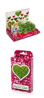 Живая открытка "Вырасти любовь" представляет собой коробочку, с одной стороны есть место для написания ваших пожеланий. Откройте открытку, высыпьте семена в контейнер, где находится специальный материал для проращивания. уже через 3-4 дня в открытке вырастет пышный газон из зелени. В комплекте вы найдете 3 тематические фигурки. Их можно разместить рядом с газончиком, вставив в специальные отверстия, а можно поставить прямо в травку. Не забывайте поливать ваш мини-садик, и он будет радовать вас долго:)