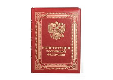 Конституция Российской ФедерацииЕдинственный в своем роде экземпляр Конституции РФ сделанный из кожи натурального дубления (марокен) с золотыми обрезами книжного блока (все тиснение сделано натуральным золотом 22 карата). Блок сшит и собран на шнурах по старинной технологии. Изначально изготавливался поштучно для высокопоставленных чиновников. Книги изготавливаются на заказ, как None