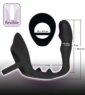Эрекционное кольцо с подхватом мошонки и анальным отростком для воздействия на простату. Гибкое, выполнено из силикона. Длина перемычки - 5 см.<br> Длина анального стимулятора - 9 см., диаметр - 3 см.<br> Диаметр кольца - 4,3 см. None