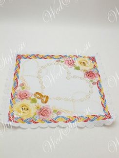 Салфетка венчальная для колец с розами (арт. 3003) RN0057 Салфетка под обручальные кольца, выполненная в романтичном стиле. Края салфетки имеют волнистую форму и украшены перфорацией. Рисунки перекликаются с традиционным свадебным стилем - в разноцветной рамочке изображены два сердца, цветущие розы и пара обручальных колец. Нарядная салфетка идеально впишется в таинственную церемонию венчания и подчеркнет ее возвышенность. Материал: габардин Размер: 23х23 см Мин. заказ 500 руб.