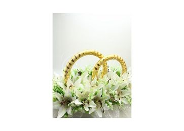 Свадебное украшение на крышу машины Gilliann CAR017 Машина молодоженов - главная в кортеже, ее украшению уделяется особое внимание. Неизменный атрибут - переплетенные обручальные кольца, как символы единения сердец. Кольца обтянуты золотистой лентой из тафты, а украшают композицию великолепные белые орхидеи, их не отличишь от живых. Материалы и декор: кольца, тафта, цветы. None