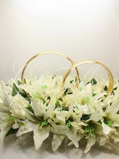 Свадебные кольца на машину большие Gilliann CAR049 Большие кольца на свадебную машину, утопающие в роскошных белых цветах. Композиция смотрится очень презентабельно. Искусственные цветы изготовлены из качественных материалов и не уступают по красоте живым лилиям. Золотые кольца имеют зеркальное покрытие, в котором отражаются цветы. Ручная работа гарантирует высокое качество и долговечность украшения. Кольцами украшают крышу свадебного автомобиля. Композиция с белыми цветами идеально подойдет для машины темного цвета. Дизайнерские украшения Gilliann сделают свадебный кортеж заметным, ярким и впечатляющим. Длина 75 см, ширина 48 см, высота - 30 см Материалы и декор: кольца, тафта, цветы. None