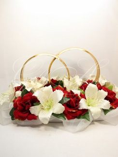 Свадебные кольца на машину с лилиями и розами Gilliann CAR050 Потрясающе яркое и праздничное украшение на крышу свадебного автомобиля. Подойдет для машины любого цвета. Два блестящих золотых кольца окружены роскошной цветочной композицией из белых лилий и красных роз. Нарядный вид придают украшению волны из пышной белой тафты. Розы декорированы золотыми блестками. Такие кольца будет сиять и переливаться на солнце, превращая свадебную машину в королевский экипаж. Композиция состоит из цветов превосходного качества, которые выглядят свежо и натурально, не уступая красоте живых цветов. Рядом с ЗАГСом и на дороге ваш автомобиль будет самым ярким и заметным благодаря исключительно качественным украшениям ручной работы Gilliann. Длина 62 см, ширина 36 см, высота - 28 см Материалы и декор: кольца, тафта, цветы. None