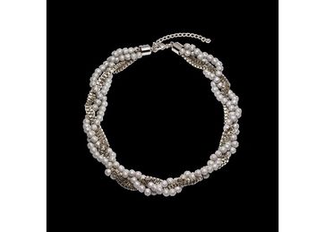 Элегантное плетеное ожерелье серебристого цвета и серьги-гвоздики с морозно-серебристыми жемчужинами.