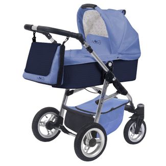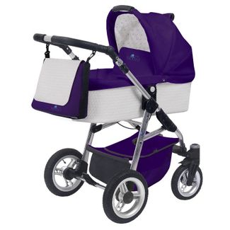 рама с 2 плавающими колесами люлька с матрасиком прогулочный блок 2 капюшона (д/люльки и д/прогулки) 2 чехла на ноги (д/люльки и прогулки ) дождевик и москитная сетка фирменный меховой конверт из натуральной овчины сумка для мамы