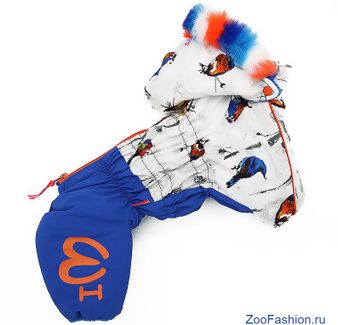 Неразъёмная молния закрывается от шеи к хвосту, упрощает одевание и снимание одежды. Высокая горловина и грудь снабжены затяжкой-резинкой для регулировки плотности прилегания. Съемный капюшон закрывает шею и защищает от ветра и осадков. Рукава с внутренней резинкой. Светоотражающие элементы: принт на штанишках, кант на пройме. Утеплен синтепоном и плюшевый мех. None