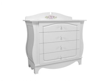 Комод МИРЭЛЬ Белый НМ 041.14 с четырьмя выдвижными ящиками - удобный и однозначно запоминающийся предмет мебели, который станет ярким дополнением детской комнаты. Модель имеет гнутые боковины и фасады с рельефным рисунком. Столешница отделана декоративными элементами и установлена на оригинальные ножки. Материал: Каркас - ЛДСП 16 мм, МДФ