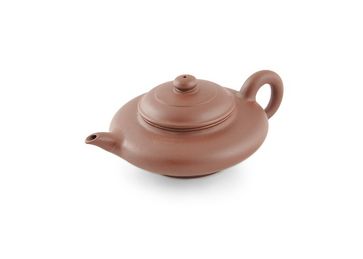 Чайник классический форма Бянь Ху ( , Плосский горшок), относящаяся к ранней Цзы Ша. Линии чайника просты и лаконичны, но из-за их изгиба требуют особого мастерства. Из-за маленького основания сам чайник выглядит парящим над поверхностью, за что иногда е... None