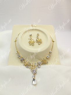 Свадебные украшения со стразами Jewardino Sposa K010901 Великолепные свадебные украшения представлены в оригинальном дизайне исполнения. Эффектный контраст золотистого плетения цепочки и сверкающих стразов приковывает взгляд. В центре колье - подвеска из кристаллов, украшают аксессуар цветочные композиции, декорированные искусственными камнями. Длина цепочки регулируется. Изящные сережки будут гармонировать с элементами цветов в прическе невесты. Привлекательный свадебный комплект дополнит платье цвета айвори или белоснежного оттенка, придав ему нотки элегантности и шарма. В комплект входит: колье, серьги None